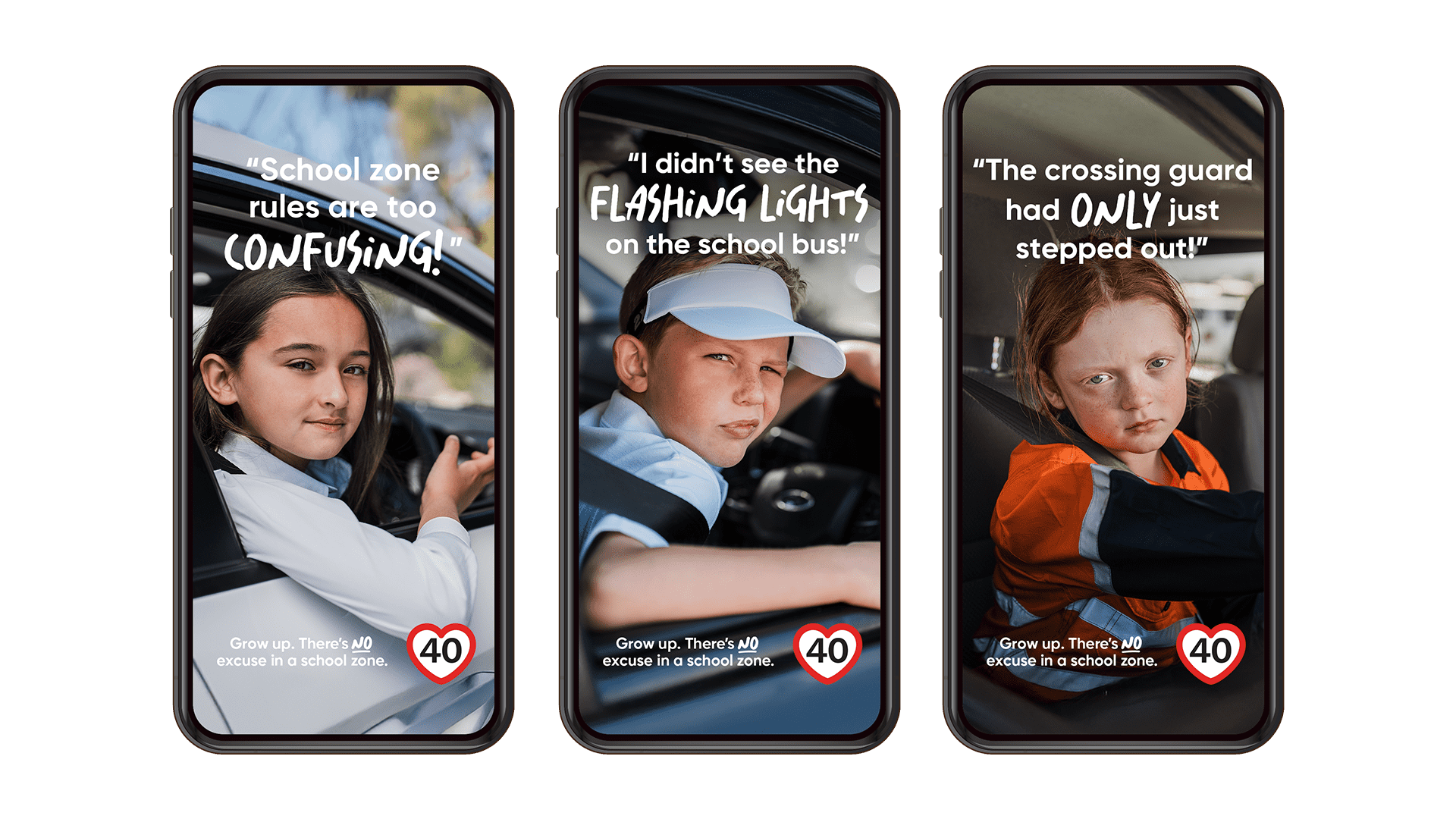 Through a series of powerful executions, the integrated campaign features school children mirroring the excuses often made by drivers with tongue-in-cheek humour and a biting honesty, taking aim at drivers who ignore speed limits, fail to stop for school crossing guards, and let a lack of concentration affect their driving in school zones.